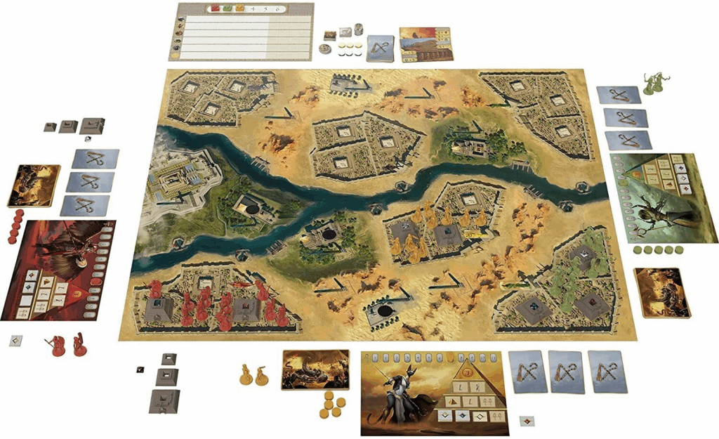 Per “Area Movement”, quindi una mappa con aree irregolari in cui muovere le proprie pedine vi suggerisco Kemet edito in Italia da Pendragon Games., che è un gioco di botte sotto l’ombra delle piramidi egizie. Ve lo giuro qui niente attese, ti teletrasporti da un obelisco all’altro e combatti fin dal primo turno. Ha pure un albero delle tecnologie, con cui potenzi la tua armata. Piramidi colorate per potenziarti, mostri giganti da summonare e cavalcare, favori alle divinità. La prima partita che ho fatto a questo gioco l’ho vinta non sapendo neanche come, visto che la strategia che avevo preso è andata faraone nel penultimo turno.
