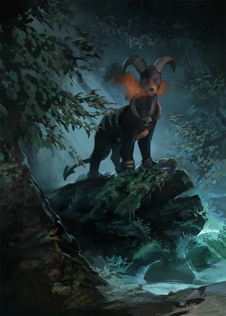 Houndoom emerge da una fredda selva oscura espirando fumo incandescente come un cane infernale. Meglio non incontrarlo nel mezzo del cammin.