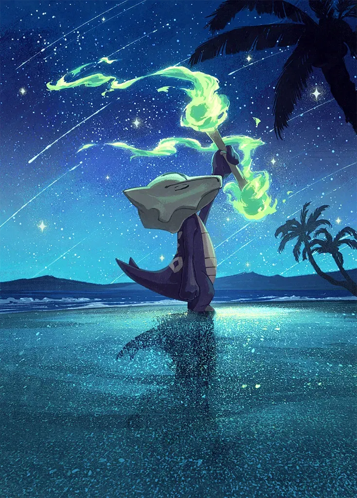 Marowak innalza il suo osso avvolto da fiamme spettrali a un cielo di stelle cadenti che sovrasta una spiaggia tropicale. Sembra commemorare qualcuno.
