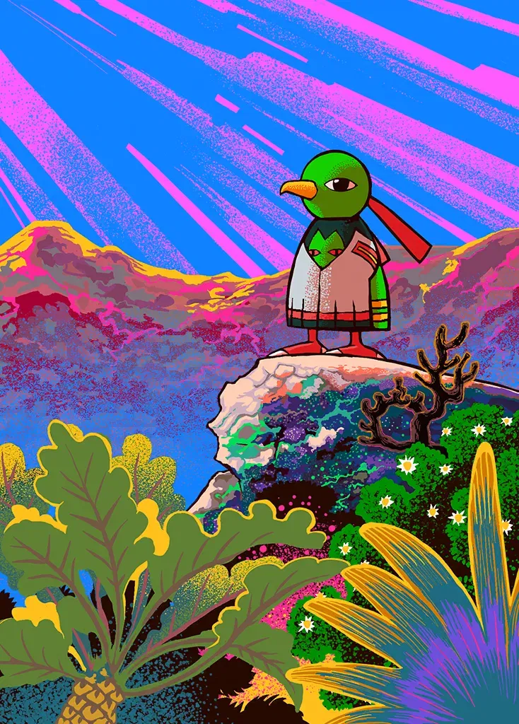 Electrode e Voltorb, con sguardo di sfida, esplodono in una palette di colori decisamente elettrica. Zapdos sullo sfondo. Staranno festeggiando l’arrivo del loro re?